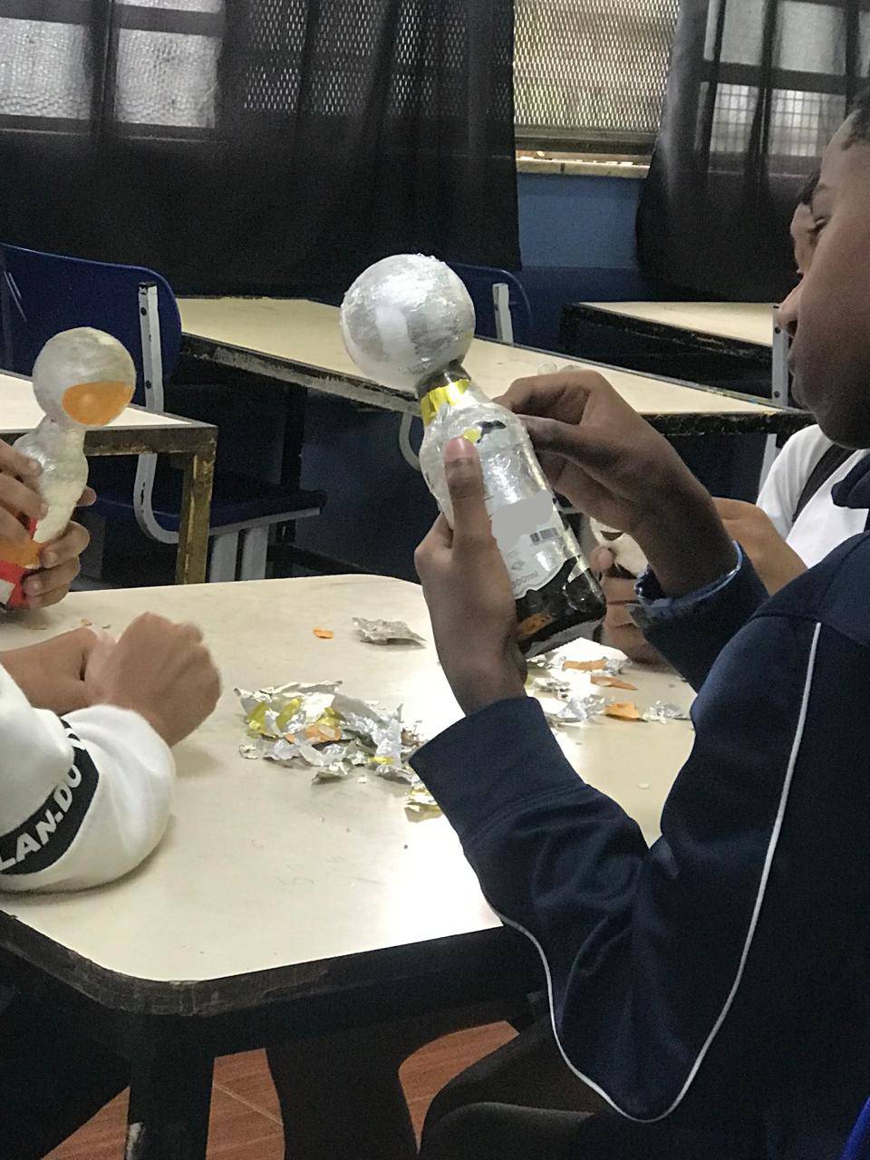 Qual o segredo? Ação e resiliência são as palavras que explicam a performance do professor e dos estudantes. Além disso, a forma com que o professor envolve os estudantes é bem atrativa. Licenciado em Artes Visuais, Eduardo trabalha o conceito artístico de Toy Art, no qual os estudantes constroem e criam bonecos. “Para isso, utilizamos, entre outros materiais reciclados, a garrafa de vidro, a bola de isopor, e a massa de papel machê, a partir da reutilização do papel sulfite”, explica.