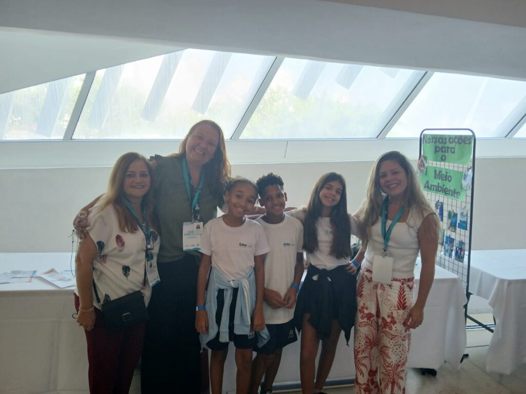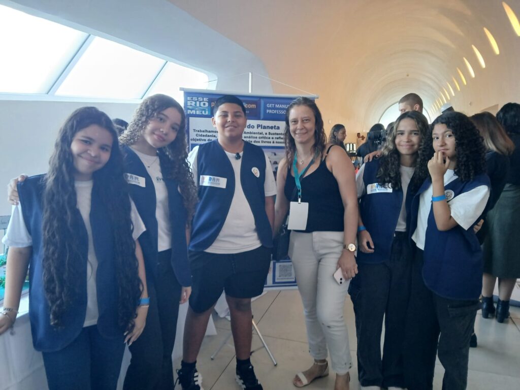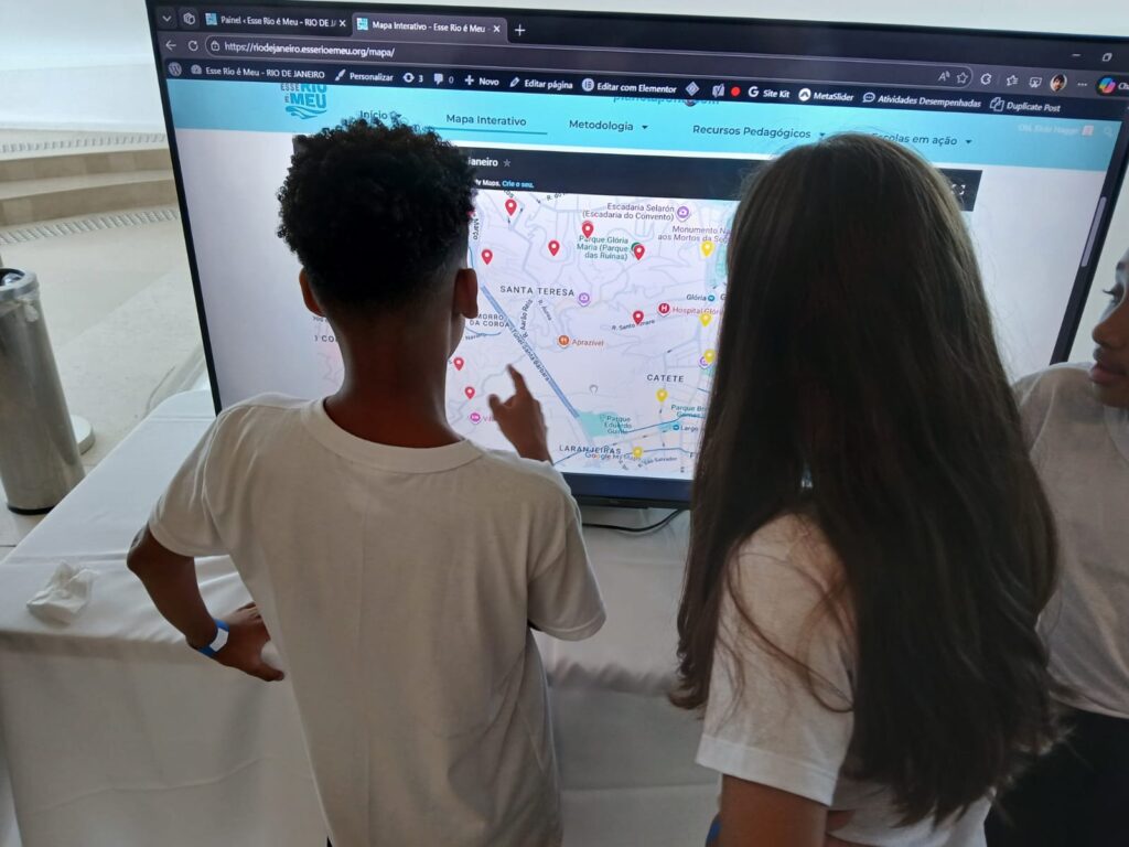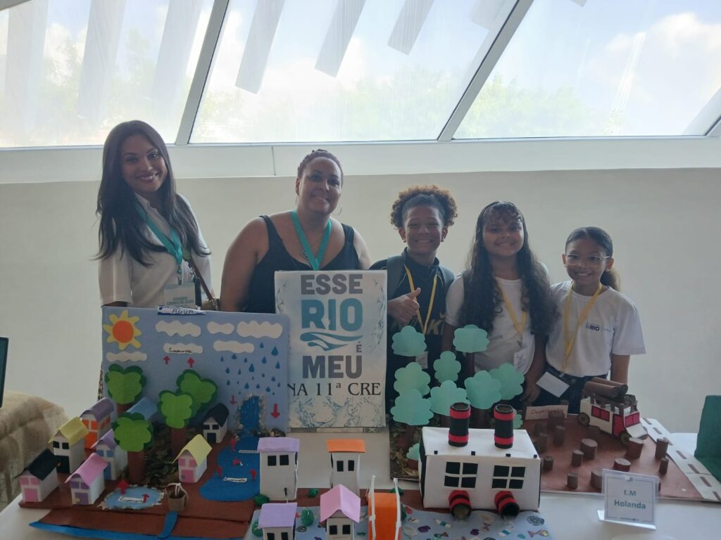 A Escola Municipal Julia Lopes, localizada no bairro da Gamboa, na região central do Rio de Janeiro, foi um dos destaques do seminário ao apresentar um trabalho consistente de educação ambiental desenvolvido ao longo de vários anos com estudantes do 3º, 4º e 5º anos do Ensino Fundamental. A proposta envolve visitas ao rio, atividades de conscientização sobre reciclagem e preservação do patrimônio hídrico e, na etapa final, a prática da reciclagem do óleo de cozinha. Cauã Miguel, Beatriz Lucas e Anne Caroline Marques, todos com 10 anos, demonstraram segurança e engajamento ao apresentar o projeto. “Sim, a gente precisa divulgar mais essas ações. Eu acredito”, afirmou Cauã. O grupo também conheceu de perto o mapa interativo dos rios da cidade, acompanhado pela professora Maria Cristina Matheus, pela coordenadora Rosangela Rodrigues e pela representante da 1ª CRE, Rosana Mello.