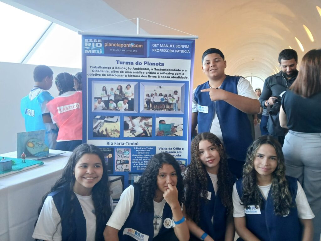 Outro grupo que chamou atenção pela energia e criatividade foi o do GER Manuel Bonfim. Pedro Bruno (13), Larissa Beatriz (12), Luiza Batista (13), Liany Fontenelle (12) e Natalia Marnet (15) apresentaram uma maquete desenvolvida para conscientizar a comunidade do entorno do Rio Faria-Timó. Mais do que uma exposição, os estudantes também integram a equipe Andar, formada por jovens jornalistas da rede municipal que atuam na divulgação de ações da Secretaria Municipal de Educação — inclusive entrevistando participantes do próprio evento. A atividade foi coordenada pela professora Patrícia Cristina.